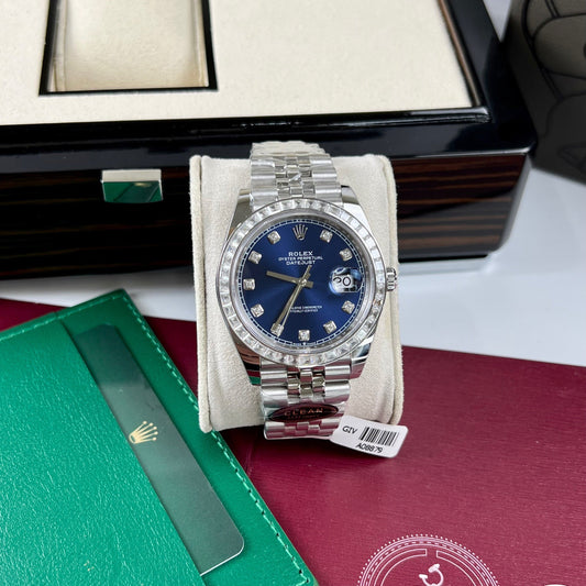 Rolex Datejust 41 Blue Moissanite Dial 126334-0016 and custom Moissanite baguette Bezel