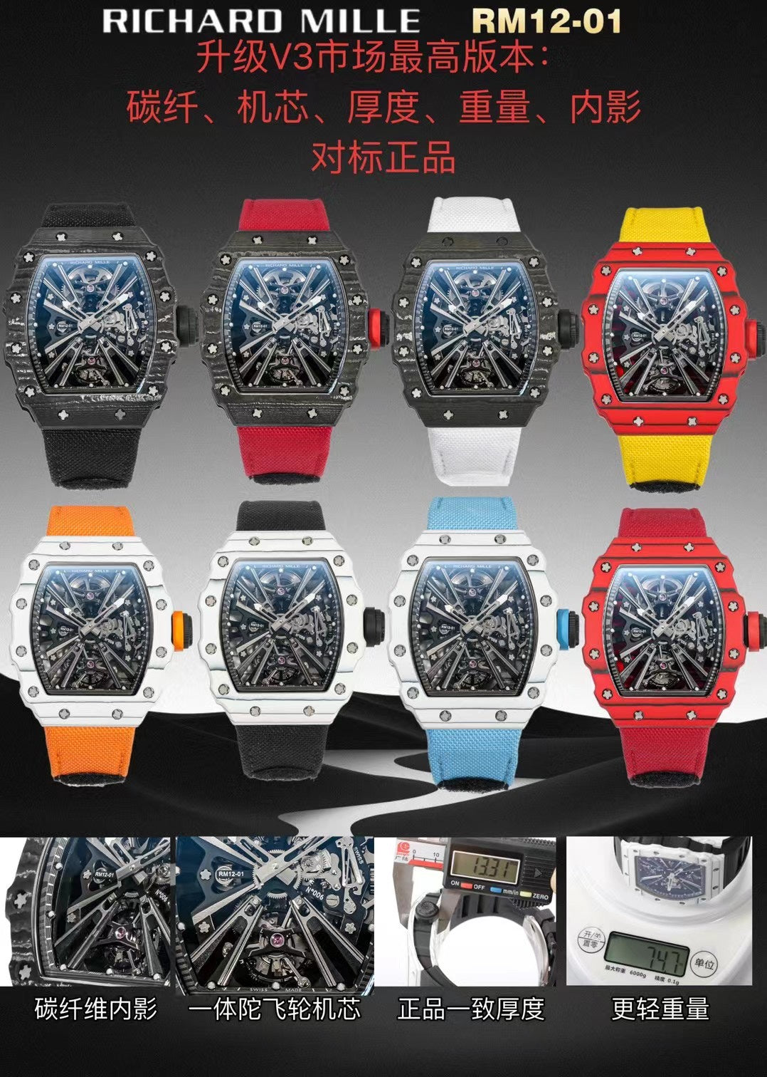 Das in limitierten Auflagen erhältliche RM12-01 Tourbillon wird in einem Gehäuse mit den Abmessungen ca. 51 x 42 x 15 mm geliefert und in den Ausführungen schwarzes Carbon-TPT, rotes Quarz-TPT und weißes Quarz-TPT angeboten.