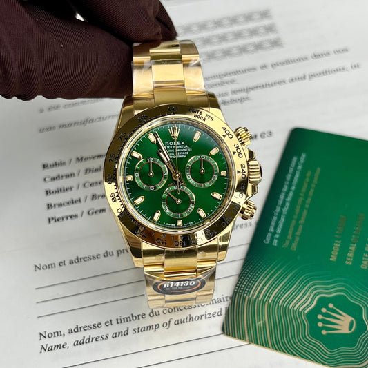 Rolex Gelbgold Cosmograph Daytona 40 Uhr, grünes arabisches Zifferblatt 116508, beschichtet mit 18 Karat Gelbgold