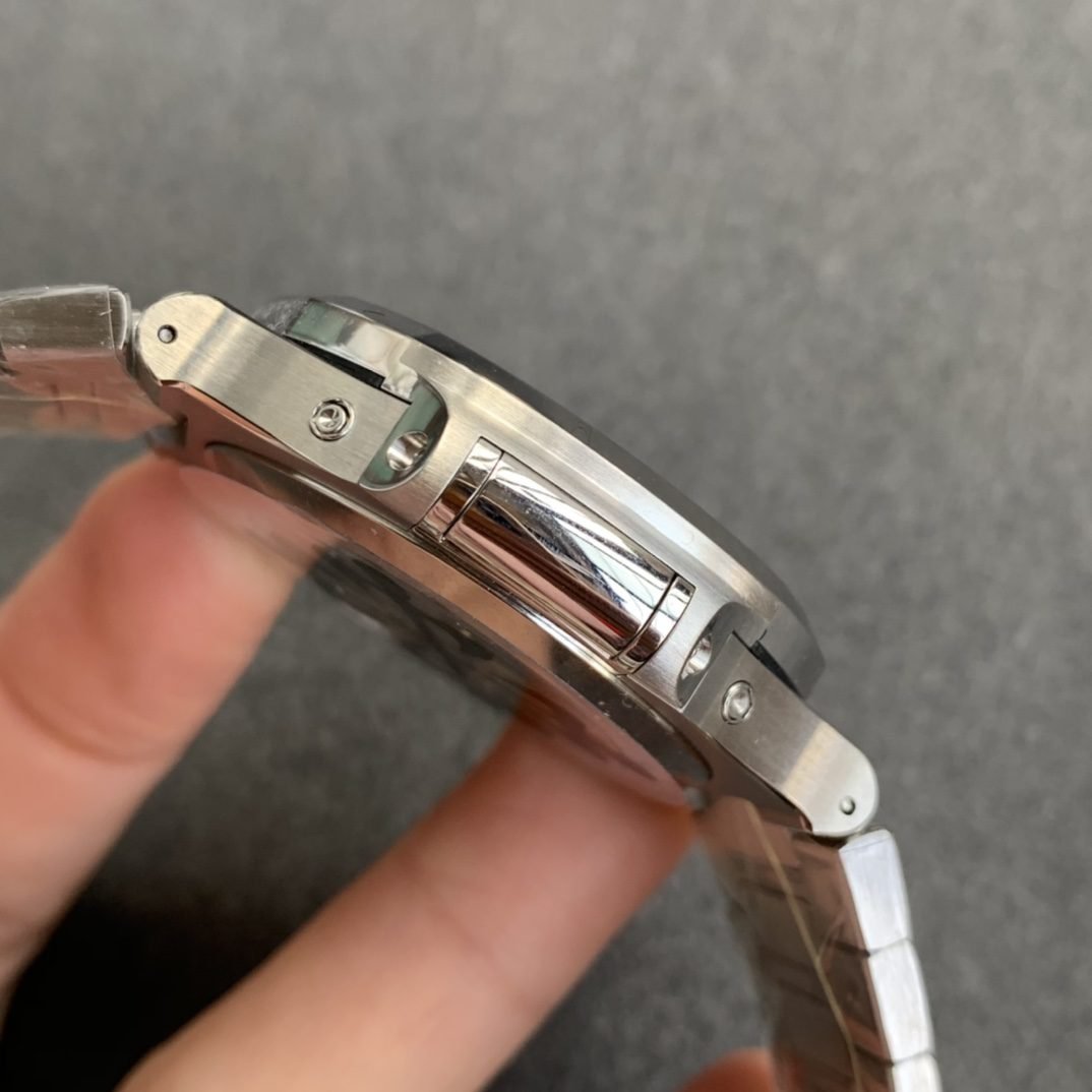 Das V3-Armband ist auf dem Markt nach wie vor konkurrenzlos und wurde mit erheblichen Investitionen entwickelt, um eine weiche und bequeme Passform zu erreichen. Jedes Segment des Stahlarmbands verfügt wie beim Original über einen dreidimensionalen Diamant-Rhombus, wodurch ein hochdimensionales Gefühl entsteht, das an jeder Handgelenkgröße bequem getragen werden kann. Die Seiten und die Unterseite sind ebenso fein poliert wie das Gehäuse. Das V3 stellt eine neue Definition der ultimativen Version des Patek Philippe Nautilus dar (aktuelle Marktversionen verwenden billige Bänder ohne den echten Diamant-Rhombus, sind nicht weich und bequem und bieten ein steifes und unbequemes Tragegefühl. Kann man es immer noch Nautilus nennen?)