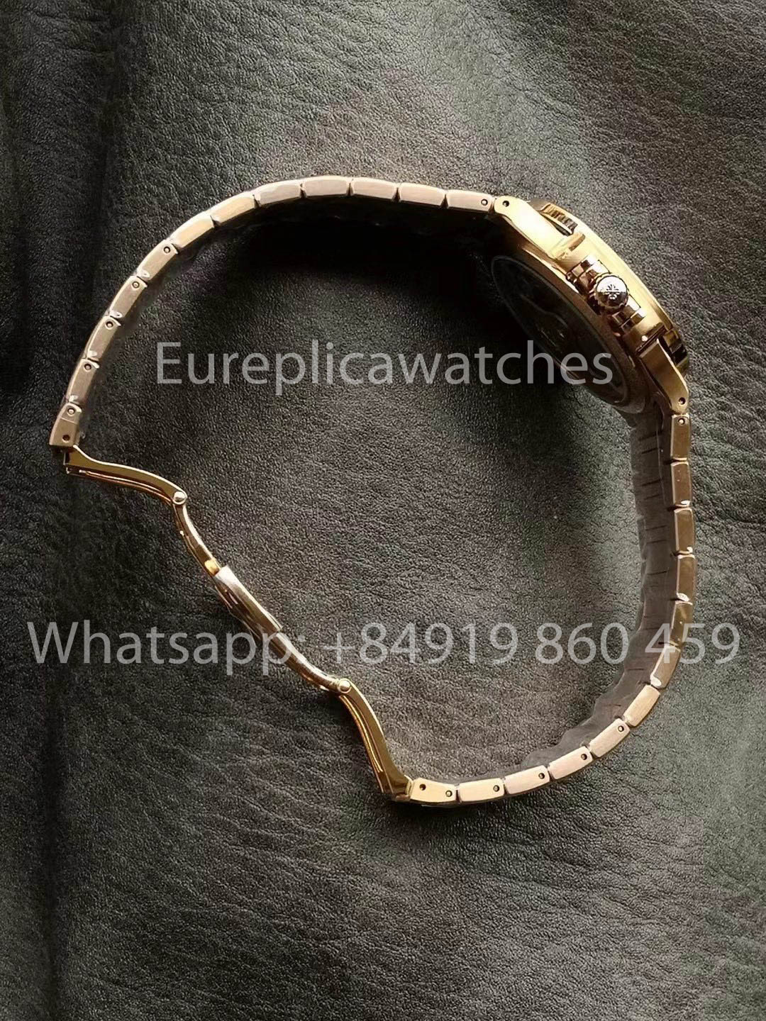 Die 3K Patek Philippe Nautilus 7118/1300R-001 ist eine atemberaubende Mischung aus Sportlichkeit und Eleganz . Sie verfügt über ein komplett roségoldfarbenes Edelstahlgehäuse und -armband mit einer Roségold-Lünette, die mit 68 Mangan-Aluminium-Granaten im Baguetteschliff verziert ist und von Champagner- zu Cognac-Tönen übergeht.