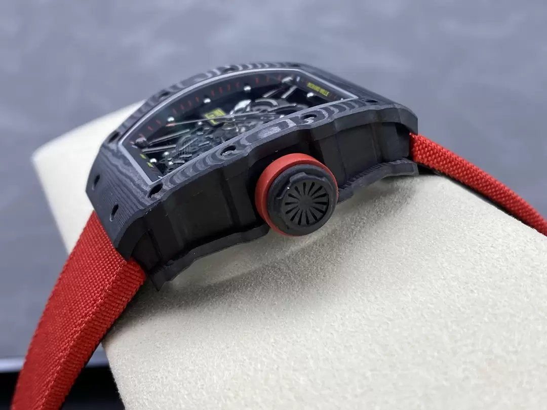 Die Richard Mille RM35-02 der G+-Fabrik hat einen herrlichen Auftritt und erreicht neue Höhen. Das Uhrwerk ist äußerst realistisch und seine Dicke entspricht dem Originalprodukt. Es ist die dünnste Version auf dem Markt mit dem geringsten Gewicht und kommt dem Originalprodukt am nächsten. Das NTPT-Muster ist so authentisch, dass es kaum vom Original zu unterscheiden ist. Die ultimative Version verfügt über ein integriertes stoßdämpfendes Uhrwerk aus weißem Saphir. Die RM35-02 mit transparenter Rückseite und integriertem Automatikwerk verwendet das NTPT-Kohlefaser-Verbundmaterial, das mit dem Original identisch ist, und übertrifft alle Repliken auf dem Markt im Detail, mit austauschbaren Teilen mit dem Original. Durch wiederholtes Feedback und Korrekturen von Uhrmachermeistern wird in einem Schritt Perfektion erreicht, sodass Uhrenliebhaber weniger für ein Produkt von höchster Qualität ausgeben können. Das NTPT-Kohlefasergehäuse reflektiert unter Sonnenlicht verschiedene reflektierende Oberflächen der Kohlefaser in verschiedenen Winkeln und setzt damit einen Spitzenstandard. Das kohlenstoffschwarze Zahnrad an der 12-Uhr-Position setzt ebenfalls eine neue Marktversion (sorgfältig ausgearbeitete Details). An der 5-Uhr-Position wurde ein weißer Saphir-Stoßdämpfer hinzugefügt. Auch die Textur des Armbands setzt einen neuen Standard auf dem Markt. Mit nur einer 35-02 sind Sie Millionär und stellen alle anderen Uhren in den Schatten!