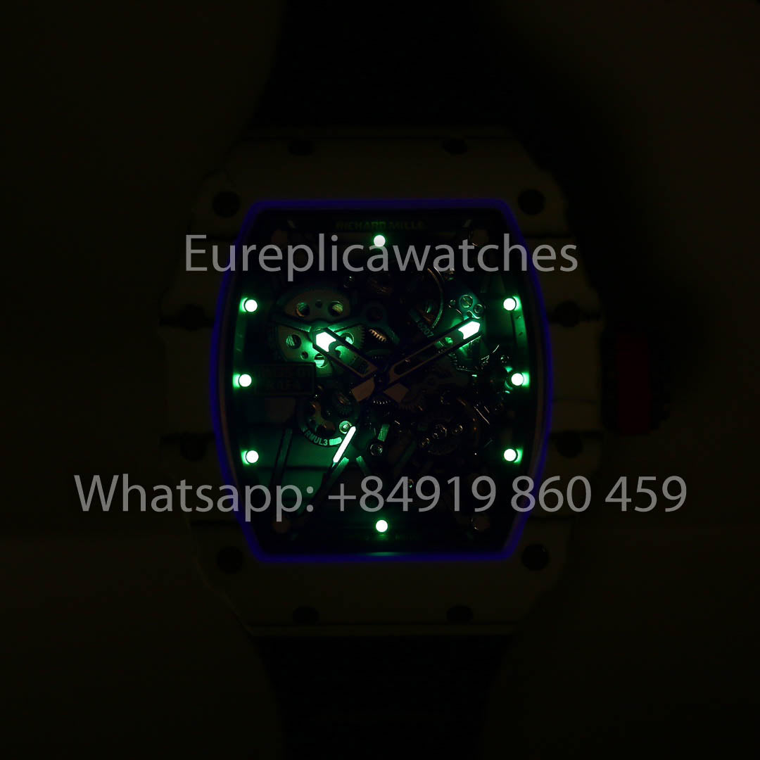 1️⃣ Uhrwerk: Ausgestattet mit dem hochwertigsten Uhrwerk auf dem Markt, dem exklusiven skelettierten integrierten Uhrwerk RMUL3 mit einem Stoßdämpfer aus weißem Saphir. Dieses Uhrwerk wurde umfangreichen Tests auf überragende Stabilität und präzise Verarbeitung unterzogen und bildet das Original perfekt nach.