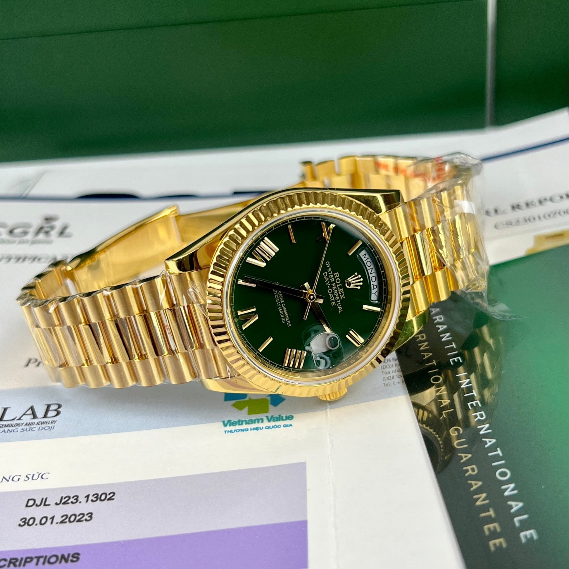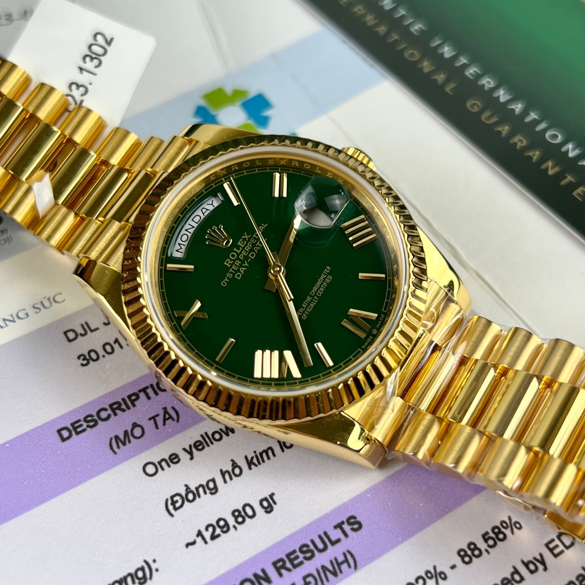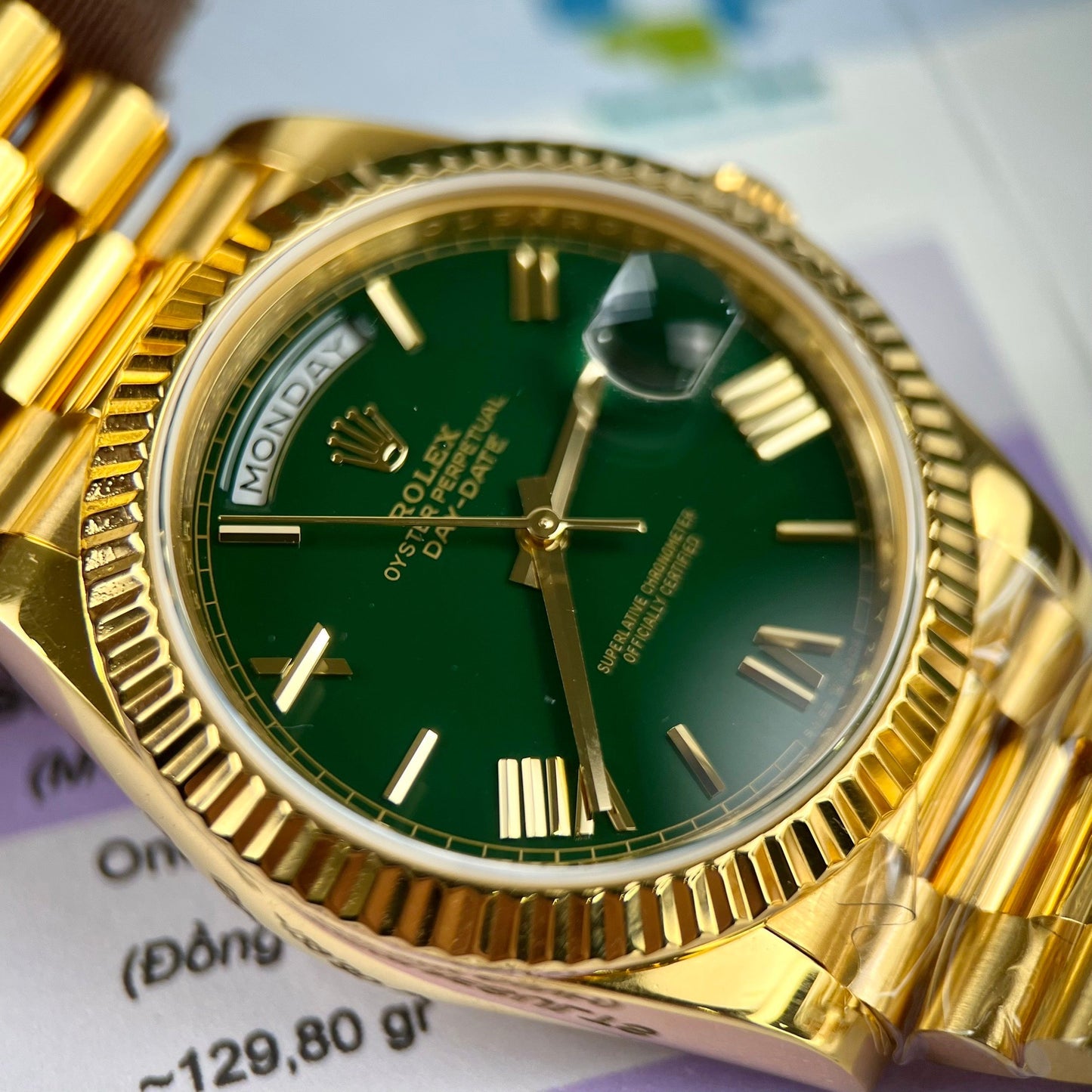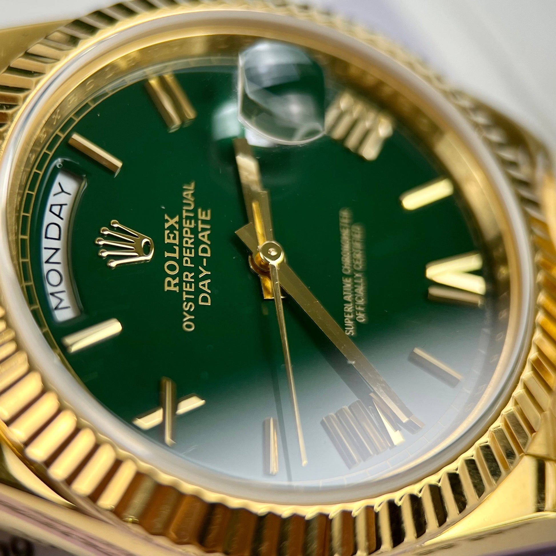Rolex DayDate 40 mm 228238 beschichtetes 18-karätiges Gelbgold, Präsident, grünes Zifferblatt, 130 Gramm
