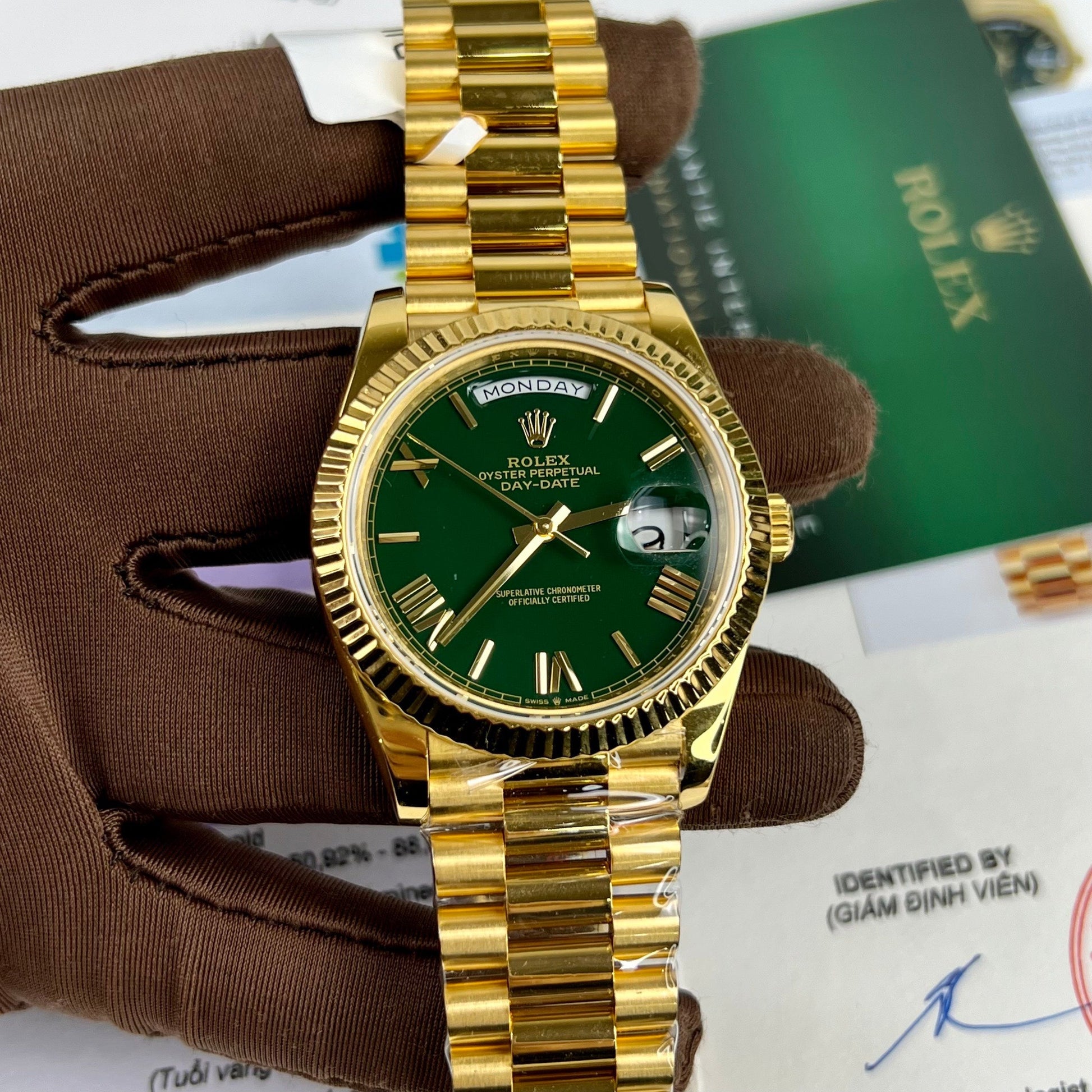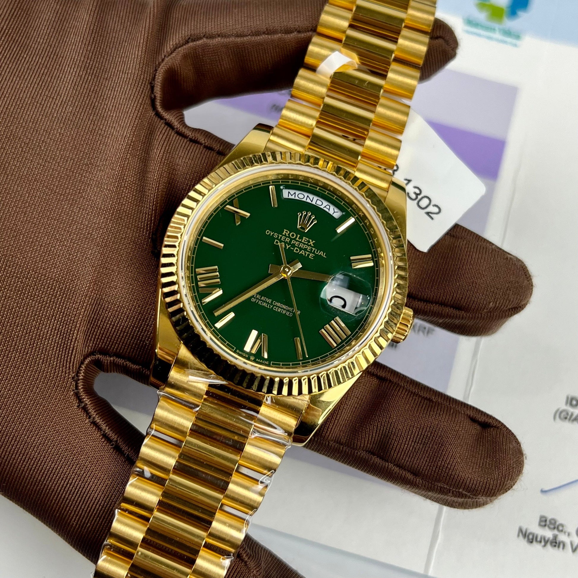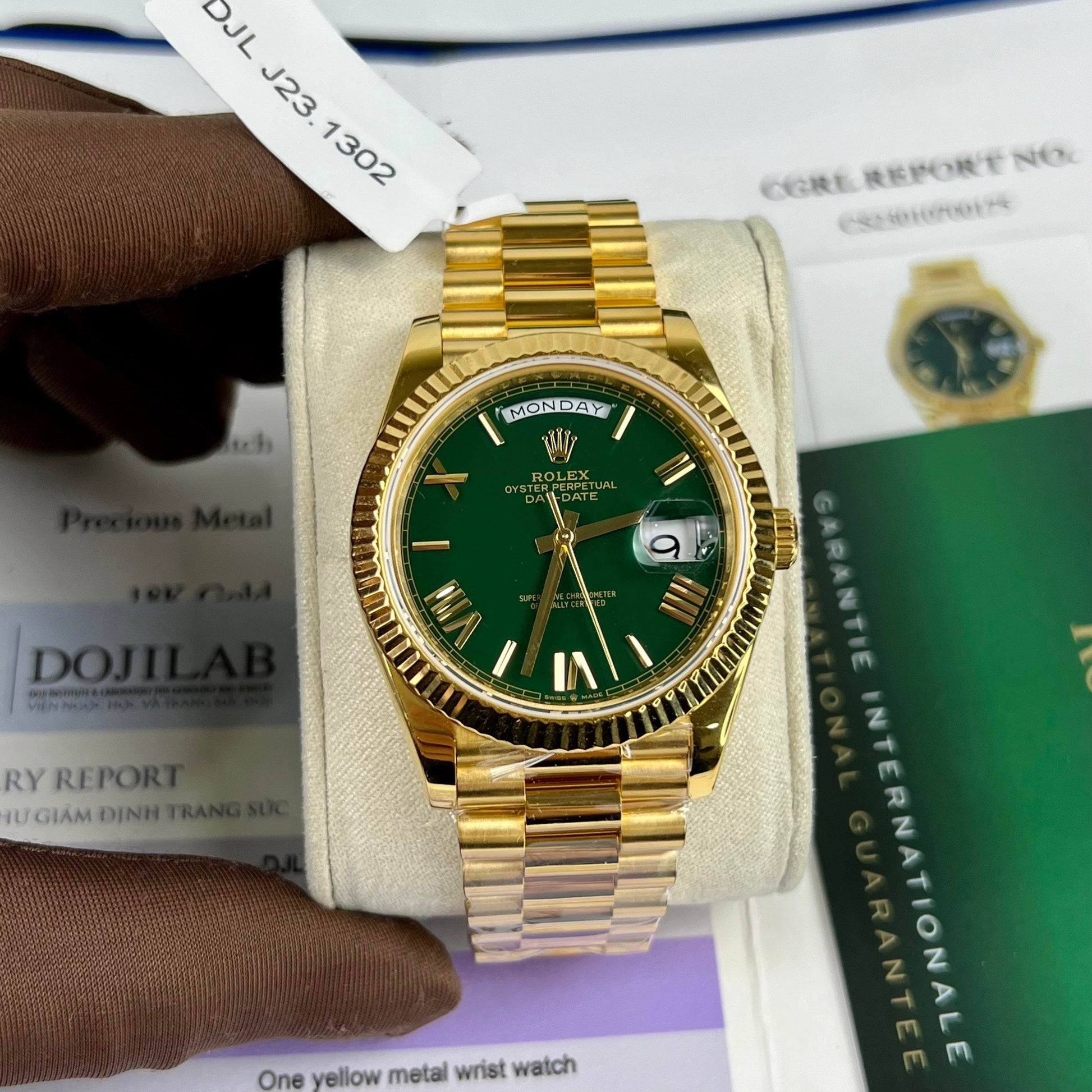 Rolex DayDate 40 mm 228238 beschichtetes 18-karätiges Gelbgold, Präsident, grünes Zifferblatt, 130 Gramm