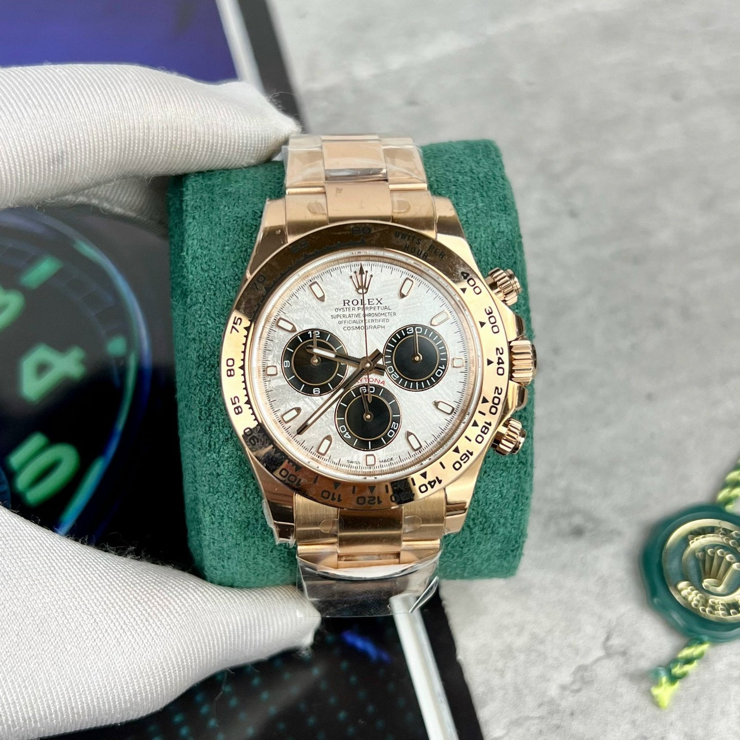 Wenn Sie nach einer perfekten Version von Daytona suchen. Dann ist dies die Version, die Sie suchen. Die Rolex Daytona aus der BT-Fabrik verfügt über die feinsten Außenlackierungen, die heute erhältlich sind. Das Uhrwerk der BT-Serie ist in der Regel leiser, vor allem wenn man versucht, es von Hand aufzuziehen, spürt man es. Außerdem liegt der Uhr eine Rolex-Karte mit einer zur Uhr passenden Seriennummer bei. Ein perfektes Produkt, das Clean in nichts nachsteht.