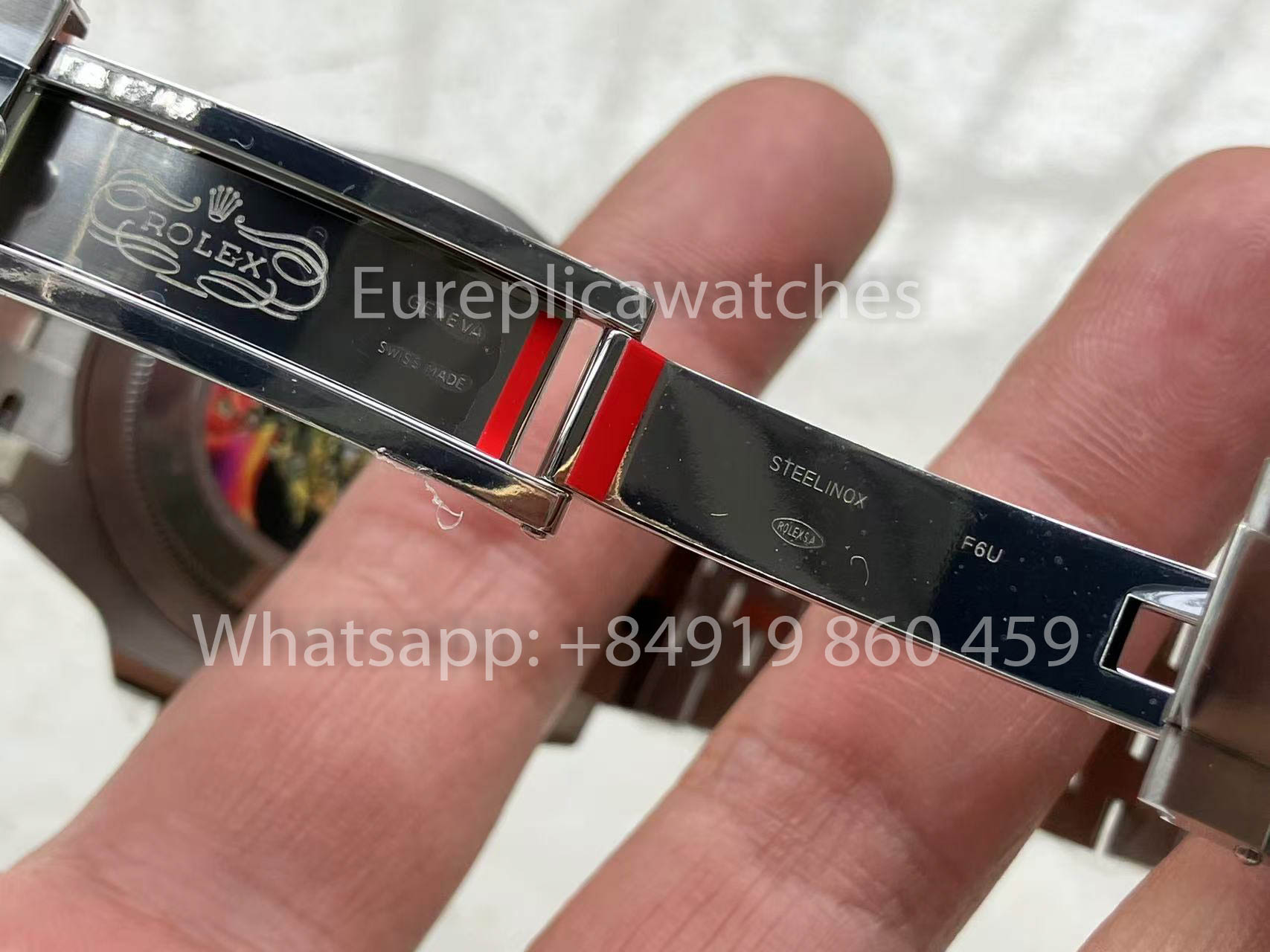 Achtung: Linkshänder-Version, mit Krone auf der linken Seite der Uhr, und der Träger trägt sie an der rechten Hand