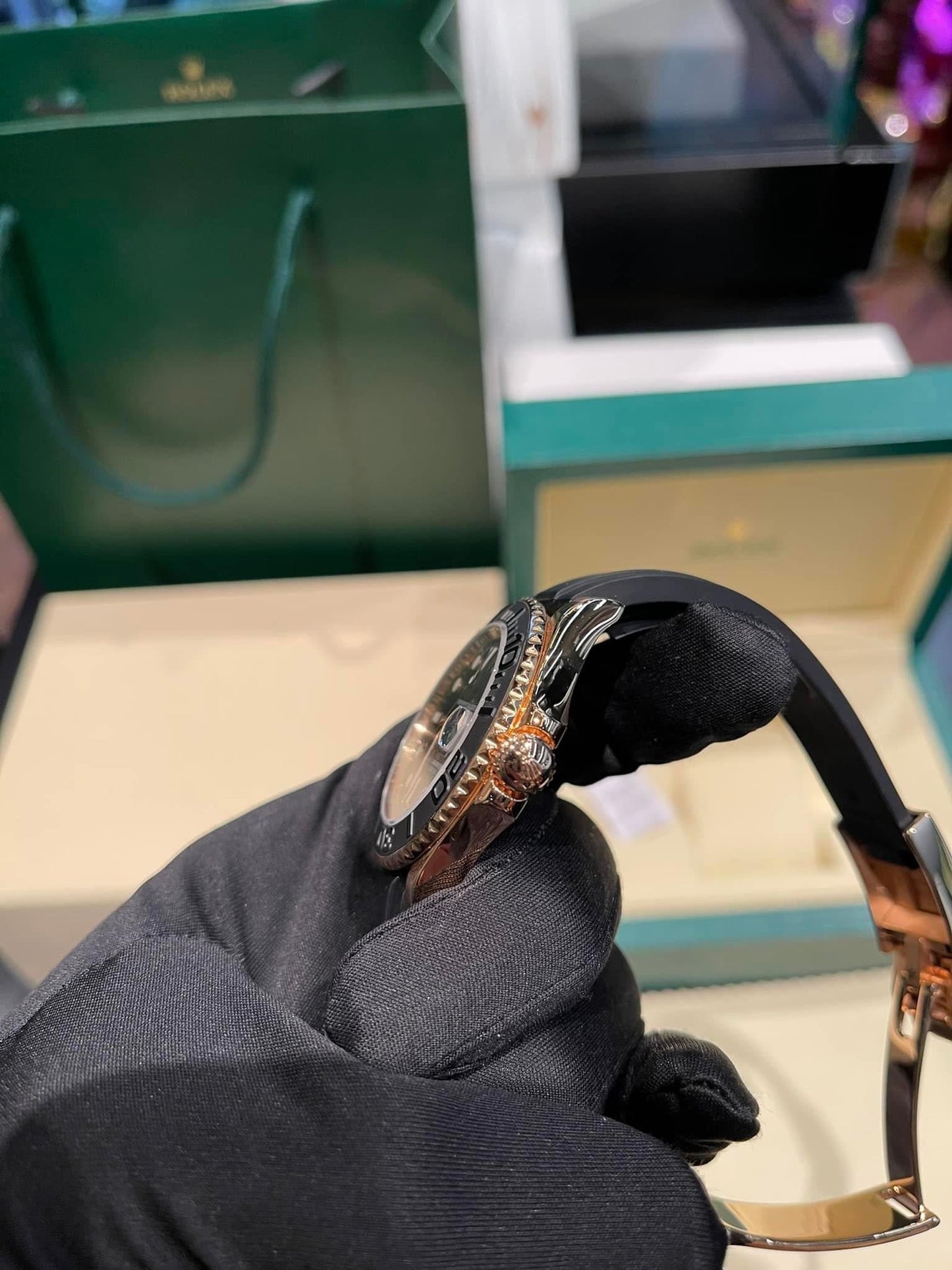 Die von Ihnen betrachtete Version wird von der GM-Fabrik hergestellt. Mit einem 3235-Uhrwerk, das Rolex perfekt nachbildet. Diese Uhr ist mit einer äußeren Goldschicht gefertigt, die sie schöner macht, einer dicken Goldschicht, die verhindert, dass sie mit der Zeit verblasst.