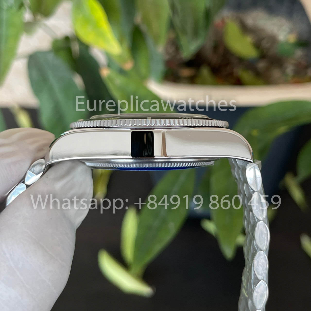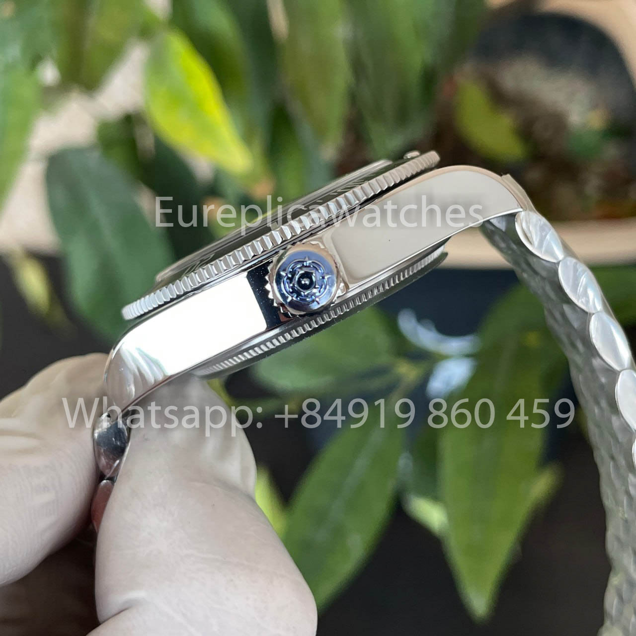 Mit einem tiefschwarzen Zifferblatt , der dazu passenden Lünette und versilberten Rhodium-Stundenmarkierungen und Zeigern bietet diese Uhr einen eleganten und modernen Look.
