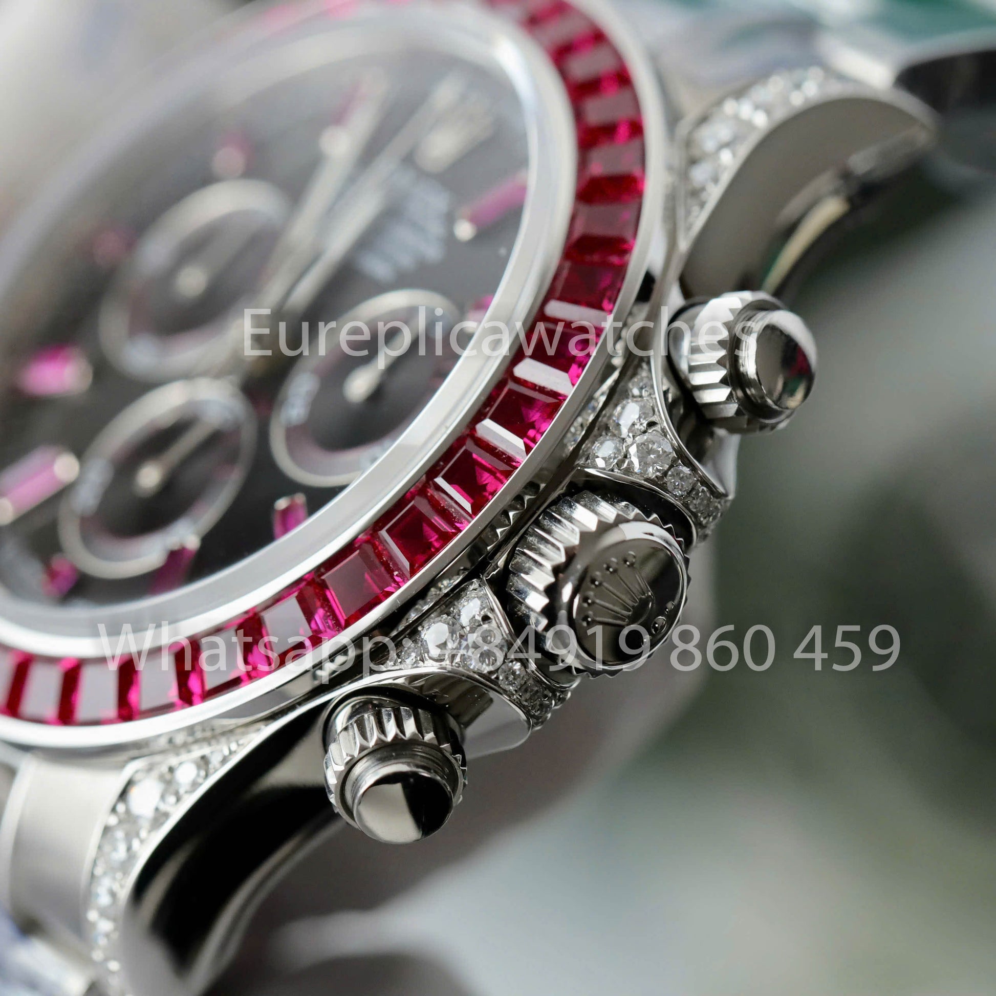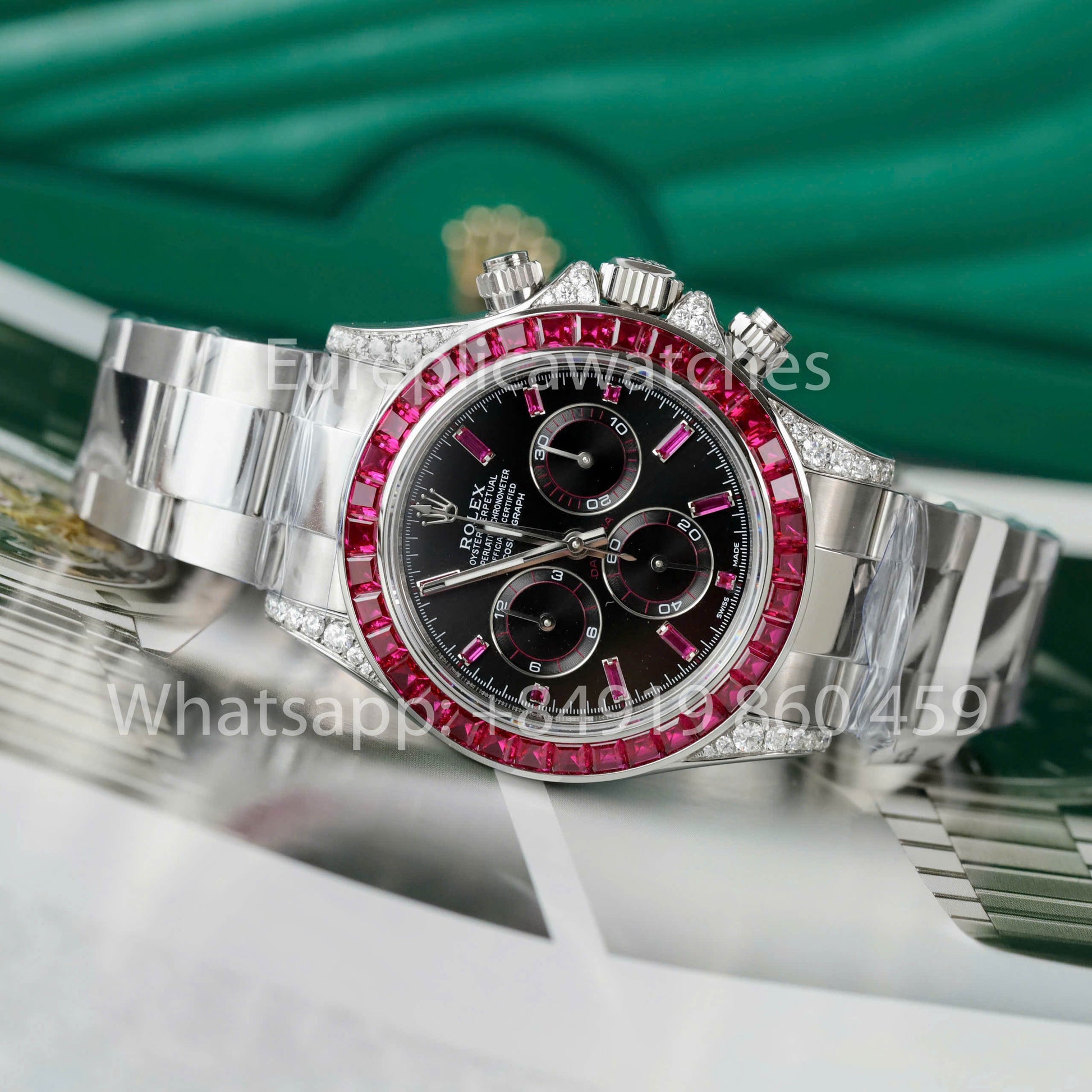 La réplique 1:1 de la Rolex Cosmograph Daytona 40 mm avec lunette saphir personnalisée et cadran noir 116520 est un chef-d'œuvre pour les amateurs de luxe et d'élégance. Conçue pour reproduire parfaitement l'originale, cette montre arbore une lunette en saphir rouge saisissante associée à des moissanites de haute qualité , offrant une brillance comparable à celle des diamants naturels.