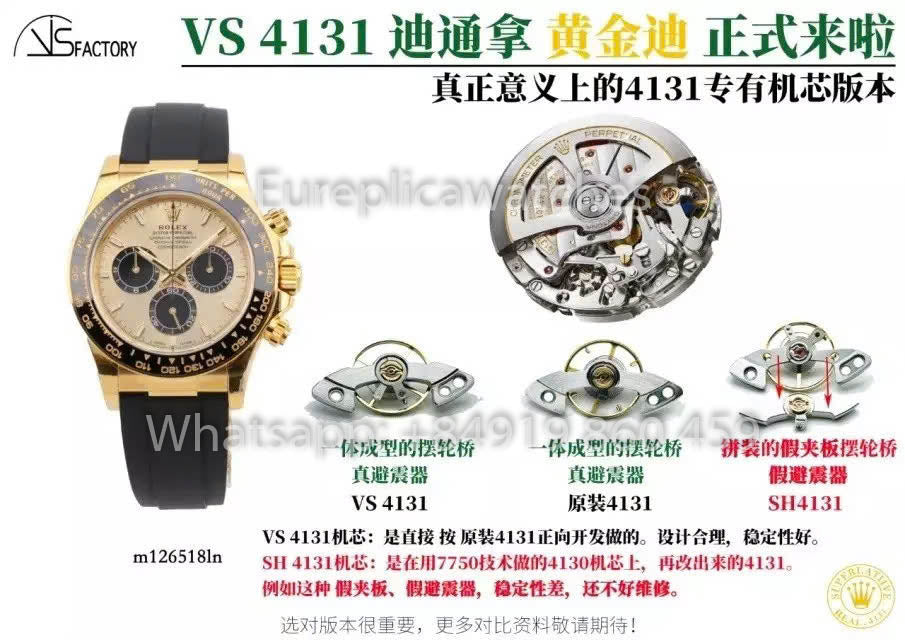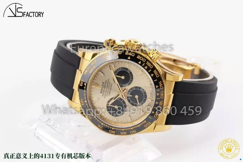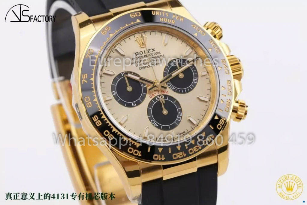La Daytona VS 4131 est un chronographe de haute précision doté d'un cadran gris ciment avec des sous-cadrans noirs, d'un boîtier en acier inoxydable 904L et d'une lunette tachymétrique en céramique noire . Ce modèle est équipé du mouvement exclusif 4131 de VS Factory , conçu sur la base de la structure de mouvement originale de Rolex .