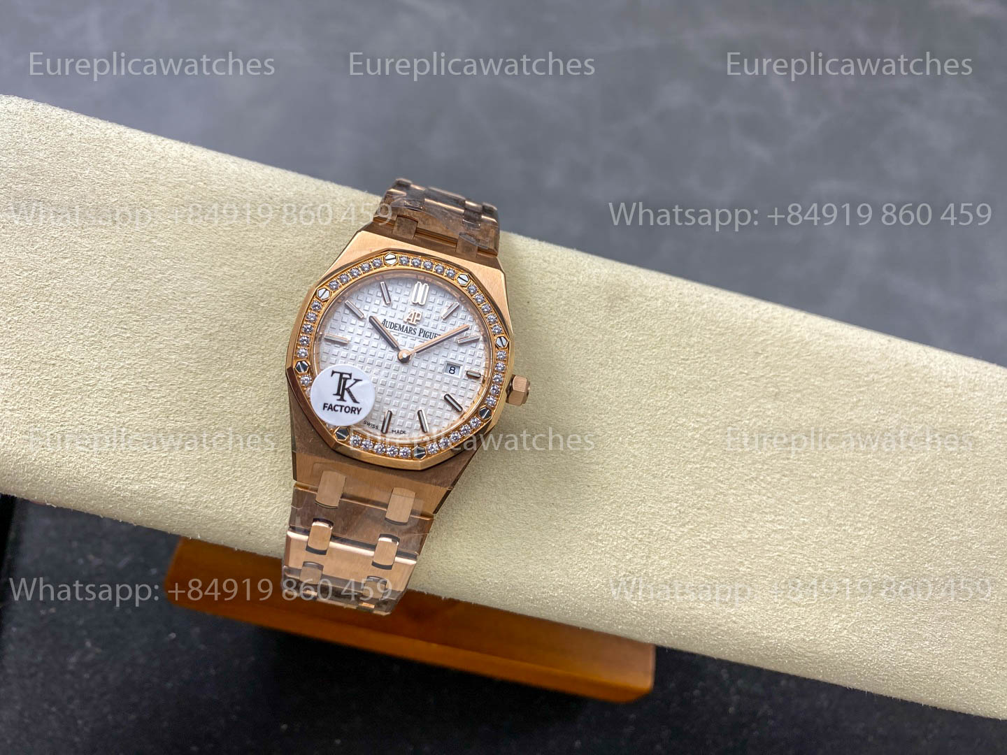 Its case and bracelet are crafted with the signature Royal Oak finishing, featuring a diamond-set bezel that enhances its luxurious appeal. Despite its compact size, the watch fully embodies the pure beauty and distinctive design that Audemars Piguet is known for.