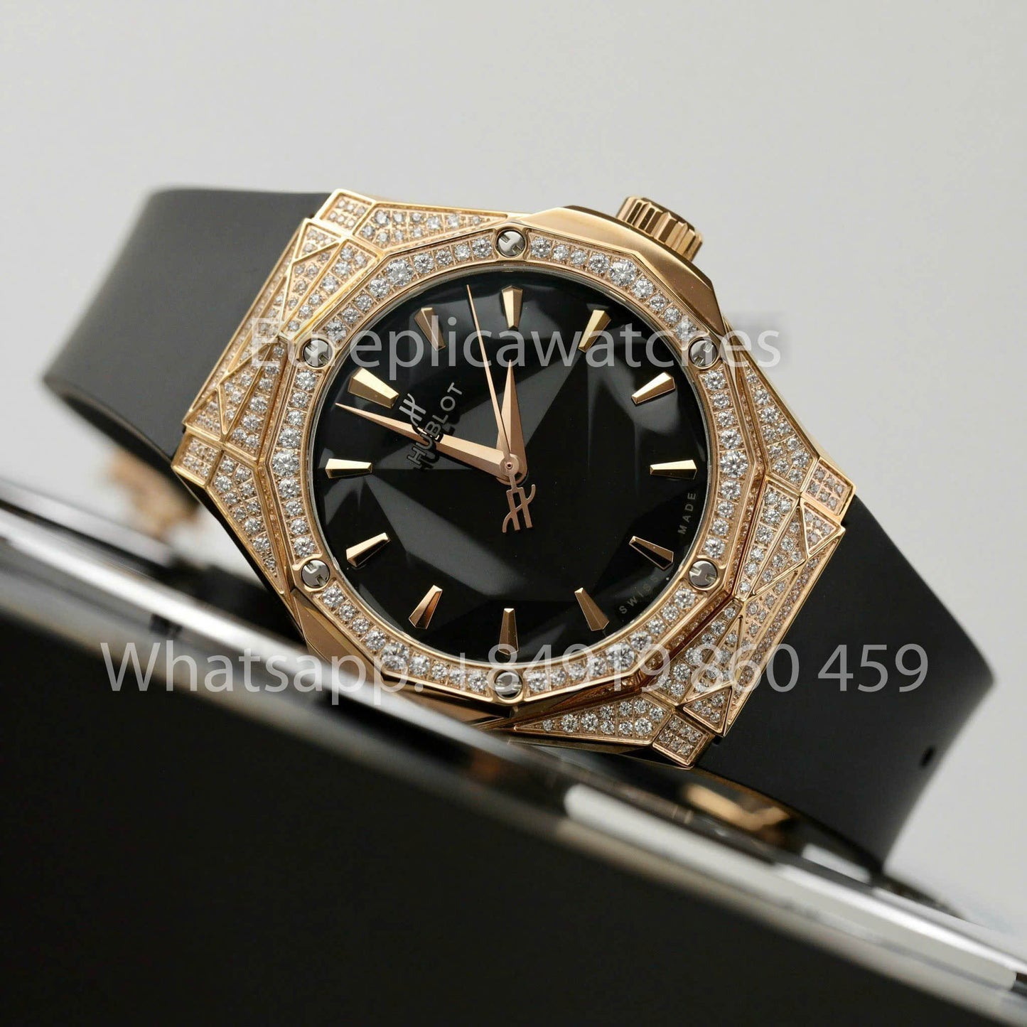 A customized hublot version as beautiful as diamonds with moissanite stones and gold filled. While much cheaper if attached with natural diamonds. In terms of brightness and perfection, it is not inferior to natural diamonds.