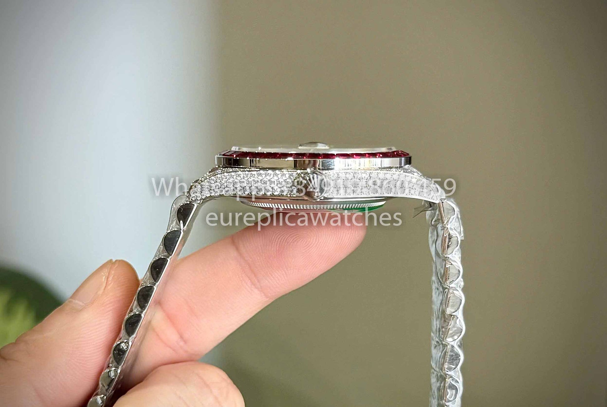 This is a custom version with the red stone being sapphire ruby and the white stone being moissanite. Making the price of the watch much more expensive than the regular stone version, while the sparkle is like the original. The quality of the stone's brightness is like natural diamonds. All the photos on our website are real photos.