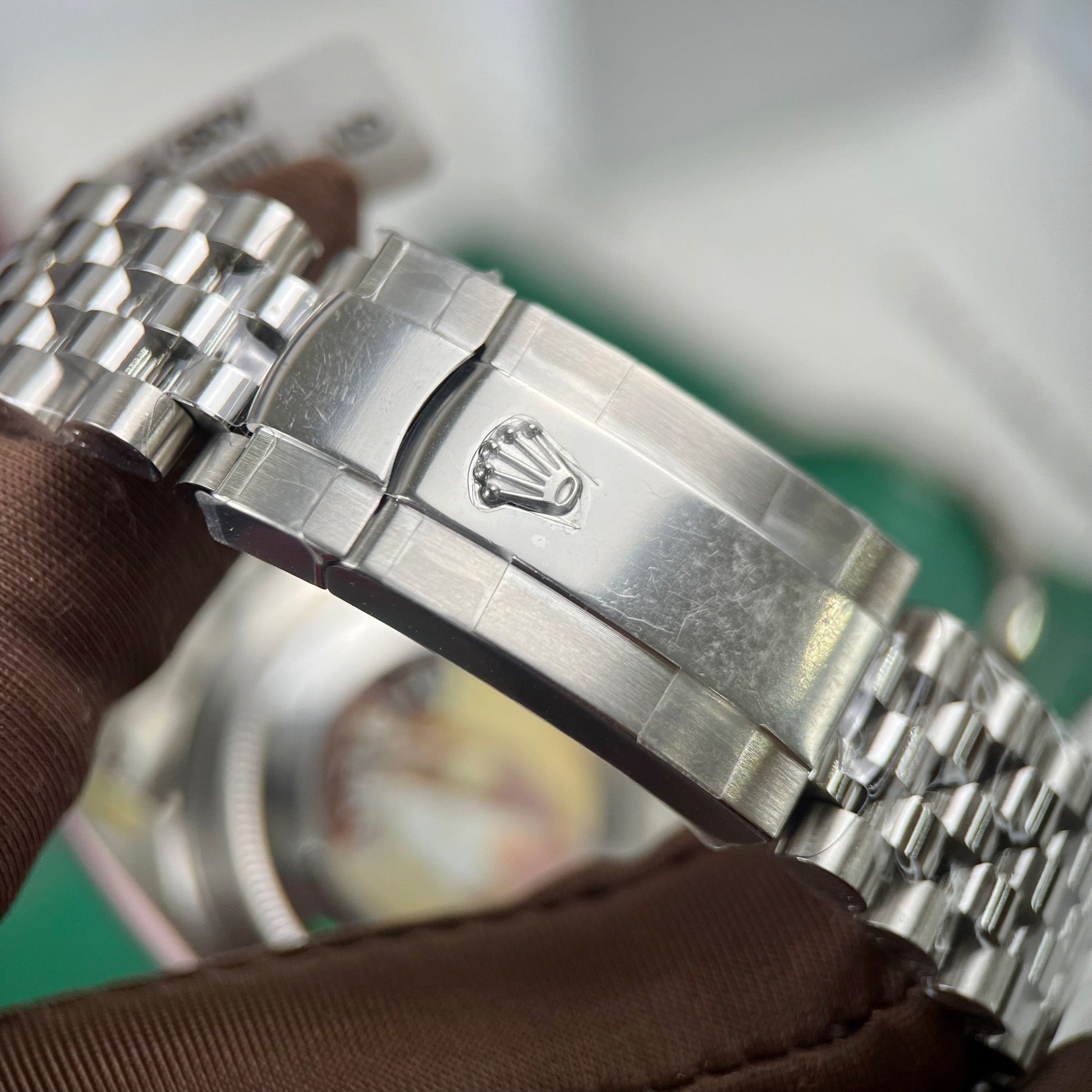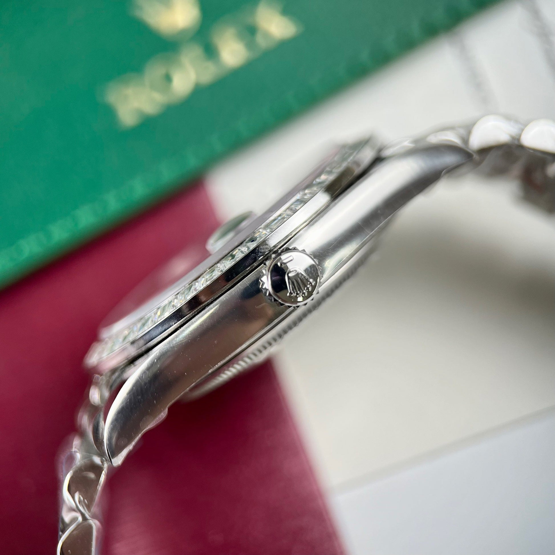 This is the best Rolex datejust currently produced by Clean Factory. The dial is clear with reflected light rays, the font is clear, and the luminescent is super bright. The stone on the watch is also a beautiful and bright diamond-like moissanite. 904L steel is also a lighter steel than other Factory. Scratch resistant sapphire glass. Custom bezel with Moissanite stone