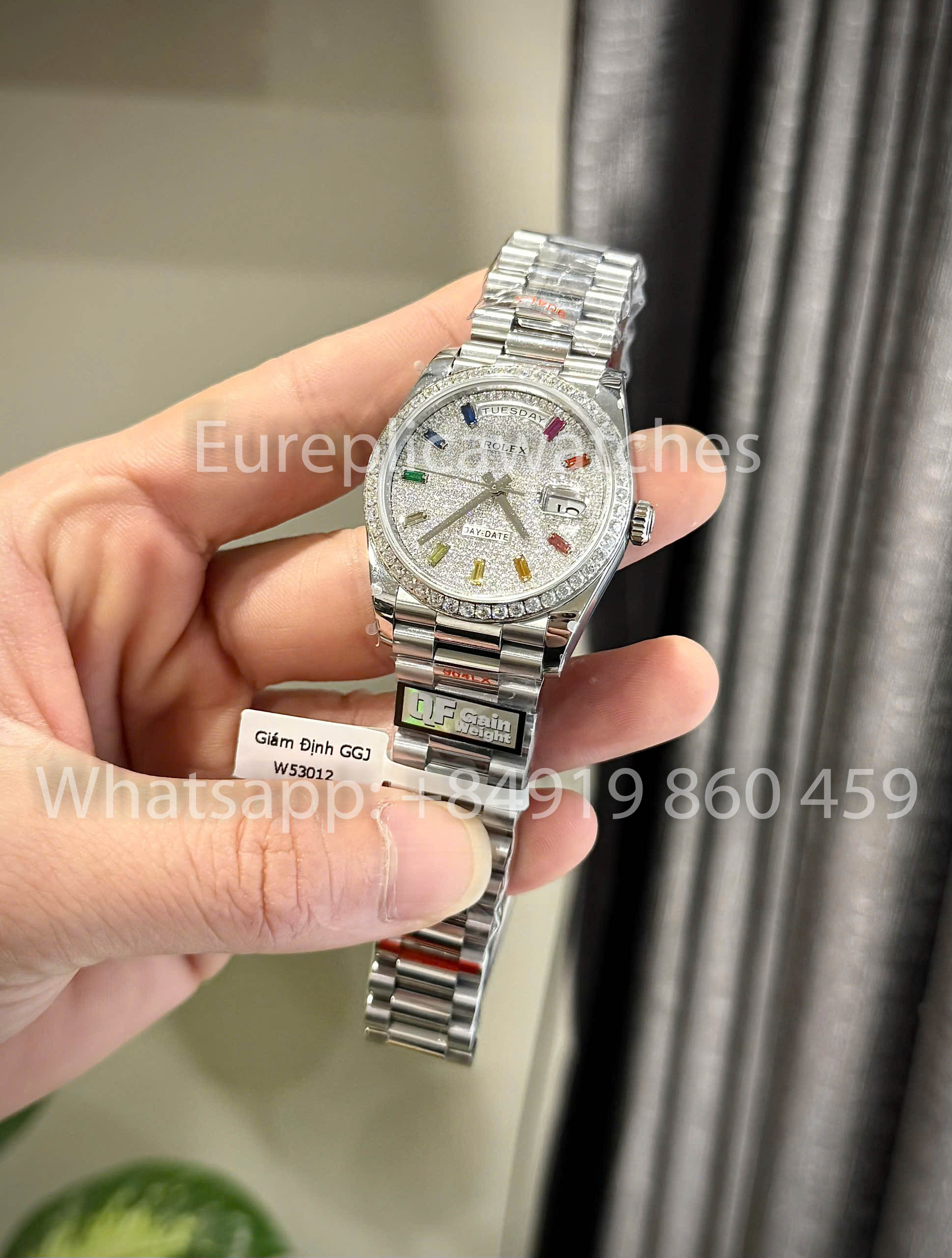 This is a high-quality replica of the Rolex Day-Date 36, featuring a 36mm platinum case. It is crafted with moissanite and ruby stones set on both the dial and bezel, replacing the original diamonds while maintaining an equally brilliant and luxurious appearance.