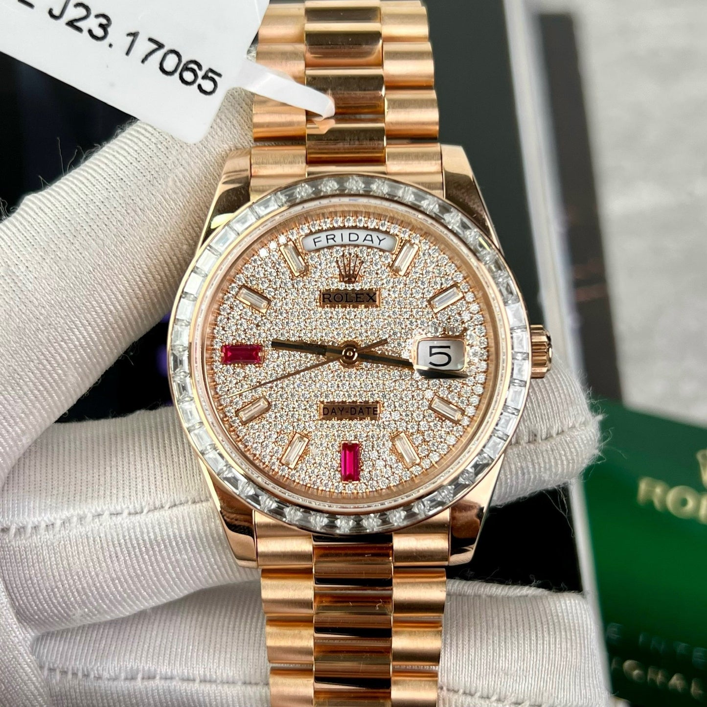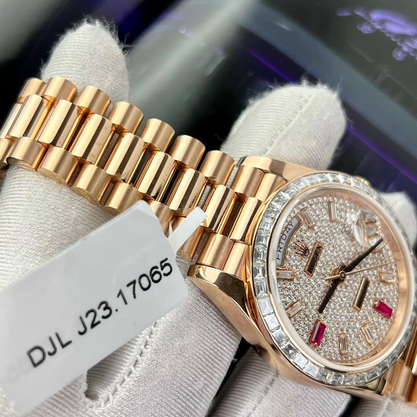 This is the super vip version of Rolex replica day date 36mm. When covered with 18k rose gold, and set with all moissanite diamonds on the dial, as well as large baguette moissanite diamonds on the bezel.