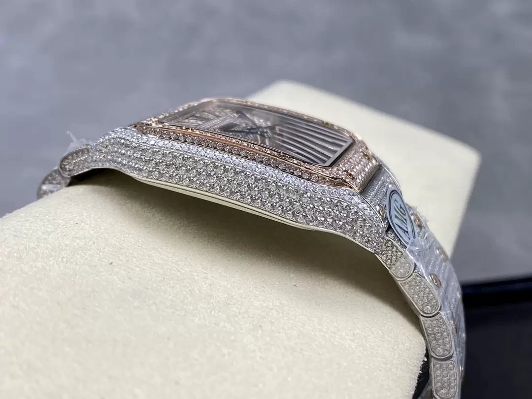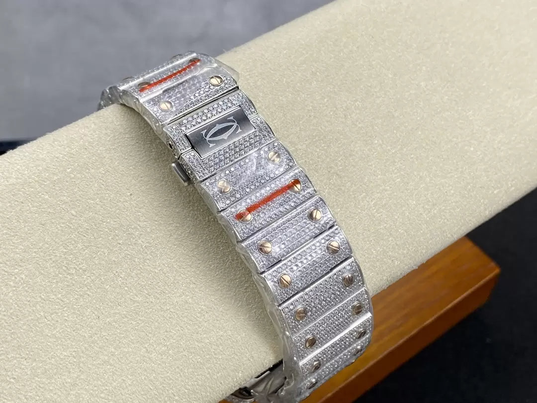 Prepare to be dazzled by the Cartier Santos Full Swarovski Stone Special Edition! Using cutting-edge high-tech inlay technology, the entire watch is meticulously hand-set with 4555 Swarovski stones, shining from every angle without any dead spots. This is the most stone-studded watch to date. The bracelet employs a seamless inlay technique, making the entire watch look stunning. Countless attempts were made to achieve the seamless inlay effect while maintaining the thickness of the original bracelet and ensuring perfect inlay results.