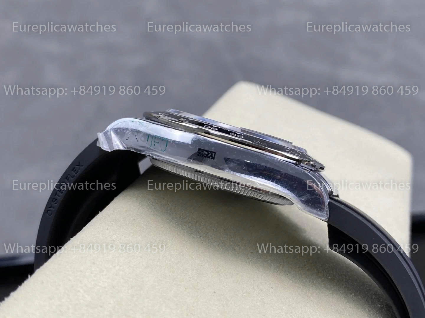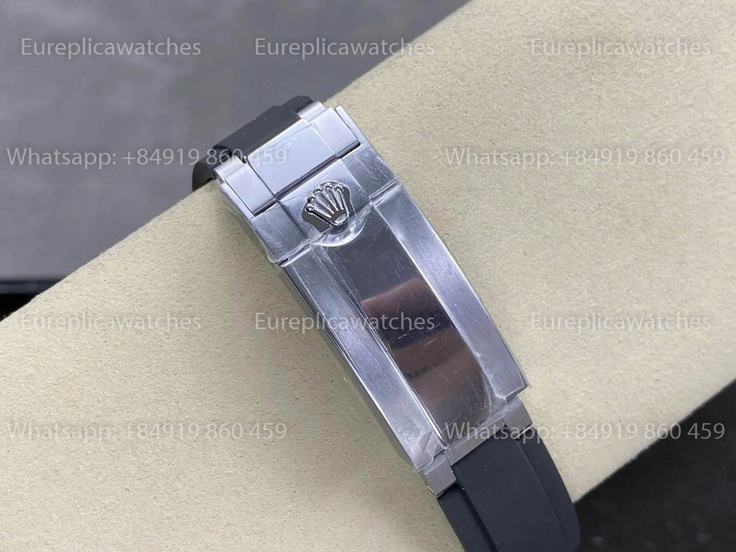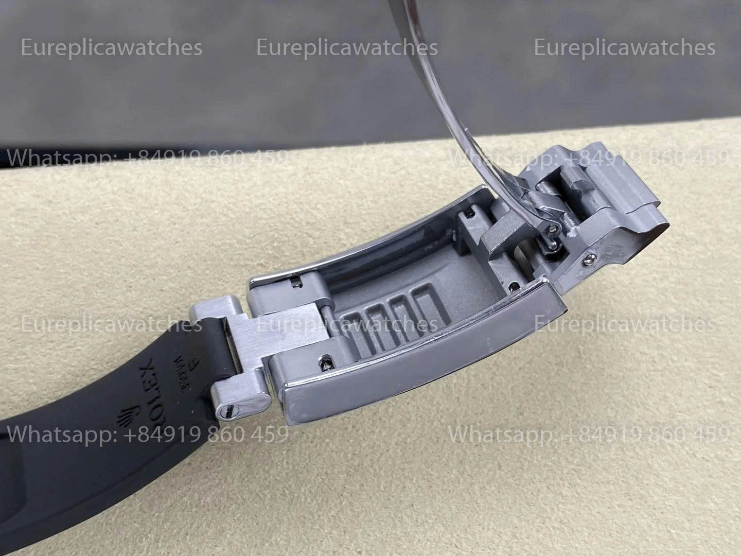 The watch is completed with a black Oysterflex rubber strap, paired with a deployant Rolex-style flip-lock clasp for secure and comfortable wear.